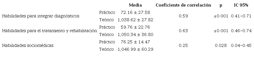 La comparación entre los resultados que exploraron las habilidades sociomédicas fue prácticamente nula. Al respecto, vale la pena aclarar que el diseño de nuestra rúbrica de evaluación se realizó con el objetivo de evaluar las competencias clínicas declaradas en el plan de estudios de nuestra institución; por ello, el rubro dedicado a las habilidades sociomédicas se enfocó principalmente en explorar la competencia para la comunicación y el profesionalismo con el paciente y, en la fase teórica, la categoría de habilidades sociomédicas exploró acciones médico-legales, vigilancia epidemiológica, funcionamiento del sistema nacional de salud y educación e investigación en salud12.