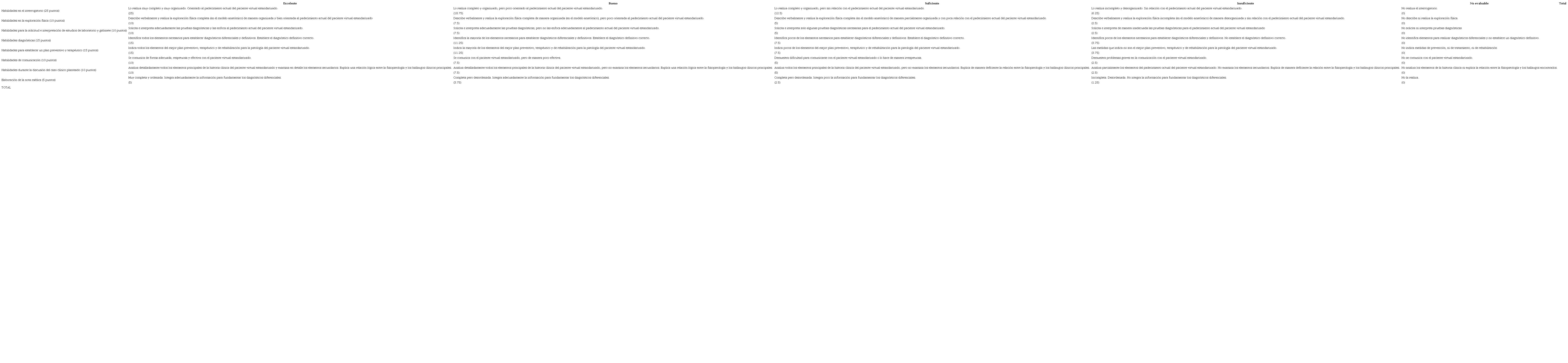 La rúbrica que se utilizó en este estudio evalúa la competencia clínica en una escala de 0 a 100. Abarca 8 dimensiones (habilidades en: el interrogatorio, la exploración física, la solicitud e interpretación de estudios de laboratorio y gabinete, el diagnóstico, el plan preventivo y terapéutico, la comunicación, la valoración global de los conocimientos y la elaboración de una nota médica) y las evalúa en 5 niveles de desempeño (no evaluable, insuficiente, suficiente, bueno y excelente).