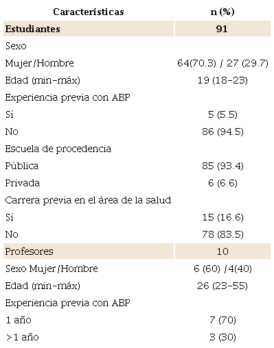 La Tabla 1 muestra las características de los estudiantes y profesores encuestados, en la cual se observa predominio del sexo femenino tanto en los estudiantes como en los profesores participantes. Además, dentro de las características sobresalientes se encontró la falta de experiencia previa en el empleo de casos a través de la estrategia de ABP.