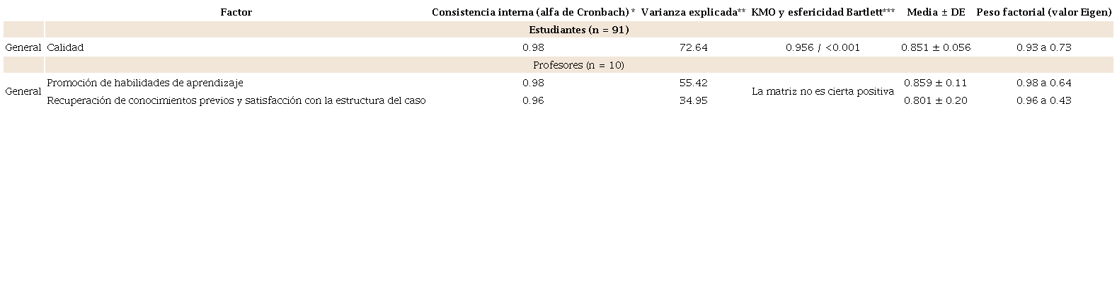 Los estudiantes que participaron identificaron un solo factor en el instrumento para los cuatro casos, el cual explica una varianza del 72.64% al que se le denominó calidad del caso clínico. Por otra parte, los profesores identificaron dos factores que en conjunto explican una varianza del 90.37%, relacionados con las habilidades de aprendizaje estimuladas en los estudiantes, así como con la recuperación de conocimientos previos y satisfacción con la estructura del caso respectivamente.