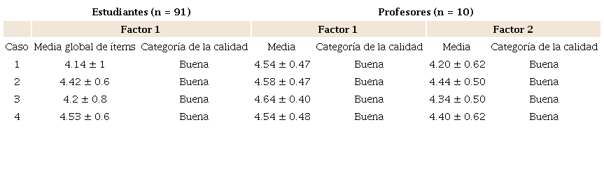 La evaluación de la calidad de los 4 casos empleados por los alumnos y profesores se estimó de acuerdo con el grado de cumplimiento de los criterios preestablecidos de formato y de función para conducir a los estudiantes a actividades de aprendizaje18,25. Para tal fin, se consideraron dos categorías para definir la calidad; baja calidad cuando se obtuvo un puntaje menor de 3 y buena calidad cuando el puntaje se mantuvo entre 4 y 516.