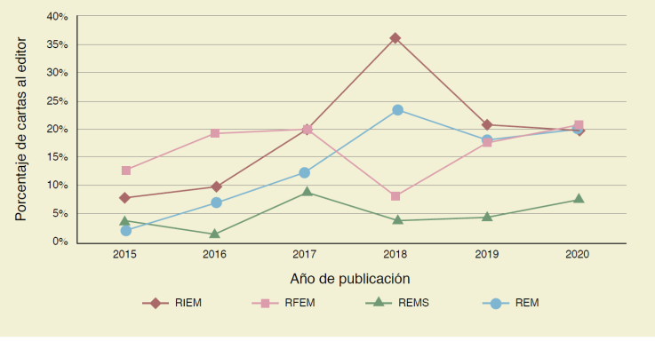 En cuanto al porcentaje por revista, el 20.82% del total de publicaciones en RIEM (66/317) fueron cartas al editor; en RFEM 16.57% (60/362); en REMS 5.02% (26/518); y en REM 16.30% (90/552). La evolución por año de la proporción carta al editor/ publicaciones totales se visualiza en la Figura 1.