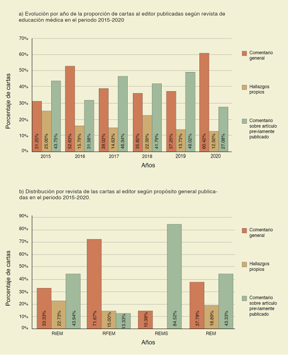 Method: A descriptive, retrospective, and bibliometric study of the letters to the editor of the journals: Educación Médica, Educación Médica Superior, Investigación en Educación Médica y la Revista de la Fundación Educación Médica. The period covered was from January 2015 to December 2020.