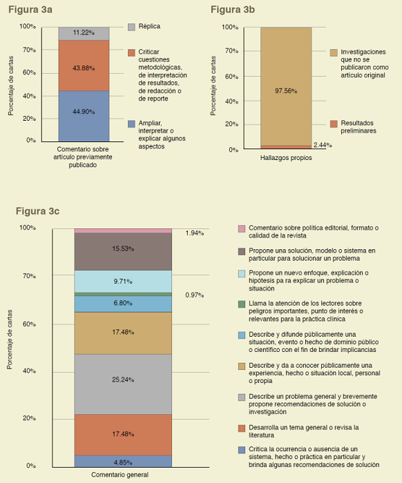 Según el propósito específico de las cartas, de las que fueron comentarios sobre artículos previamente publicados, 44 (44.90%) tuvieron el propósito específico de ampliar, interpretar o explicar algunos aspectos (Figura 3a); de las que fueron de hallazgos propios, 40 (97.56%) correspondían a investigaciones que no se publicarían como artículo original (Figura 3b) y, de las que fueron de comentario general, 26 (25.24%) fueron de descripción de un problema general y brevemente propone recomendaciones de solución o investigación (Figura 3c).