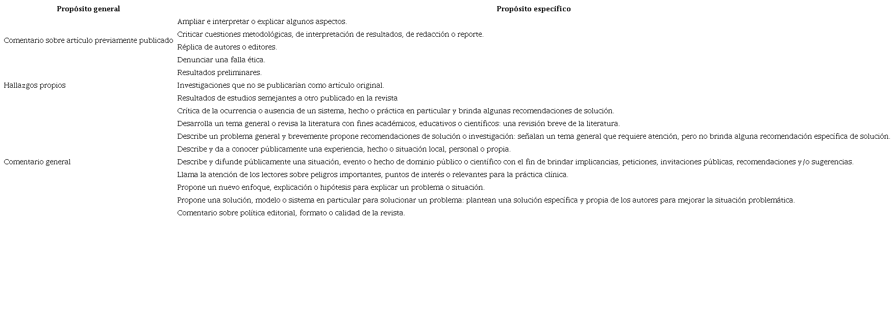 Los comentarios, opiniones y sugerencias son manifestados a través de las cartas al editor. Definidas como comunicaciones cortas de artículos previamente publicados, investigaciones originales que no llegan al artículo original o comentarios sobre temas generales que requieren cierta atención debido a su novedad o implicancia5. Además, con la posibilidad que el autor del artículo comentado tenga una respuesta a la opinión manifestada en forma de réplica. Lo que da lugar a una correcta retroalimentación e intercambio de ideas que permiten mejorar la información a futuros lectores.