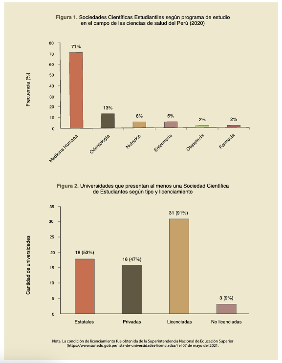 Results: Of the 143 universities analyzed in Peru, 105 had at least one program related to Health Sciences, 32.4% (n=34) had at least one SSS; most of them were in state universities. Eleven universities presented more than one SSS, so a total of 52 SSSs were registered, 71.2% (n=37) in the Human Medicine program. The founding period of the SSSs ranged from 1991 to 2020. Their main activities included: teaching courses on scientific writing, publication of articles, participation in competitions, workshops and seminars related to research methodology.
