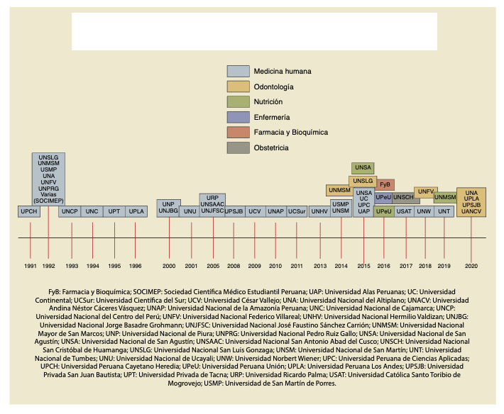 El periodo de fundación de las SCE varió desde el año 1991 hasta el año 2020, la primera en ser fundada fue la Sociedad Científica de Estudiantes de Medicina de la Universidad Peruana Cayetano Heredia, mientras que las SCE del programa de Odontología fueron las últimas en ser creadas. Durante el año 1992 se fundaron siete SCE, año en el cual se fundaron más sociedades. Desde el año 1991 hasta el 2014 ha predominado la creación de las SCE del programa de Medicina Humana, aparece en el 2014 la primera SCE en un programa diferente (Figura 3).
