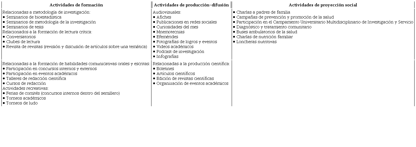 Las principales actividades que realizan las SCE peruanas incluyen el dictado de cursos relacionados a redacción científica, publicación de artículos, participación en concursos, talleres y seminarios relacionados a metodología de la investigación. Las distintas actividades que desarrollan las SCE fueron agrupadas en actividades de formación académica, actividades de producción-difusión y actividades de proyección social; las actividades de formación fueron las más frecuentes en la mayoría de SCE (Tabla 1).