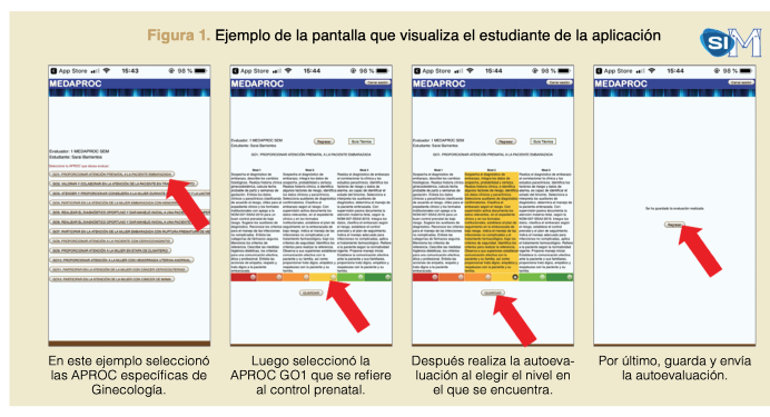 Se cuidó que el diseño de la aplicación electrónica “medAPProc” fuera atractivo, funcional al plantear una misma secuencia de acciones para evaluar a cada estudiante y la misma terminología en los cuadros de diálogo, menús y ventanas. También se procuró que fuera amigable, esto es, de fácil uso e intuitivo, al contener instrucciones bien formuladas y cuadros de diálogo emergentes que guiaran al usuario para realizar los pasos. Fue desarrollada con la característica de ejecutarse sin acceso a la Internet, almacenar los datos y al momento de tener una red WiFi el usuario los puede enviar, ya que en algunas sedes hospitalarias hay zonas sin red de Internet (Figura 1).
