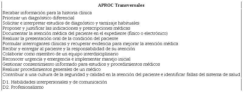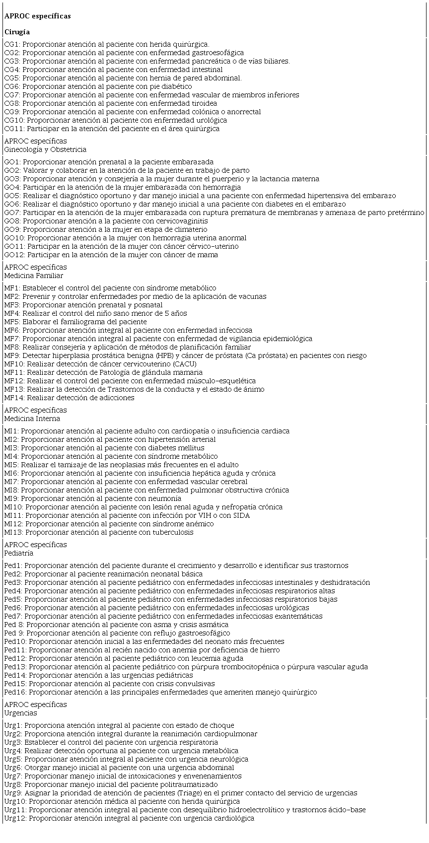 El Modelo Educativo para Desarrollar Actividades Profesionales Confiables (MEDAPROC) surgió en el año 2012 en respuesta a las necesidades derivadas de la implementación del Plan de Estudios 2010 de la Facultad de Medicina de la UNAM (FM). El equipo multidisciplinario del MEDAPROC, con base en la propuesta de la Association of American Medical Colleges (AAMC), la cual presenta 13 actividades que el médico realiza en su quehacer cotidiano y permiten desarrollar las competencias7, naturalizó las EPA en la FM como Actividades Profesionales Confiables (APROC) al añadirles características propias del contexto médico nacional. MEDAPROC generó dos tipos de APROC, transversales y específicas, las primeras con base en las 13 actividades de la AAMC, y las segundas fueron creadas para cada una de las seis rotaciones del IM (cirugía, ginecología y obstetricia, medicina familiar, medicina interna, pediatría y urgencias). Una vez definidas las 78 APROC específicas (Tabla 1) y las 13 transversales, se integraron 2 dominios: comunicación y profesionalismo (Tabla 2), dando un total de 93 APROC.