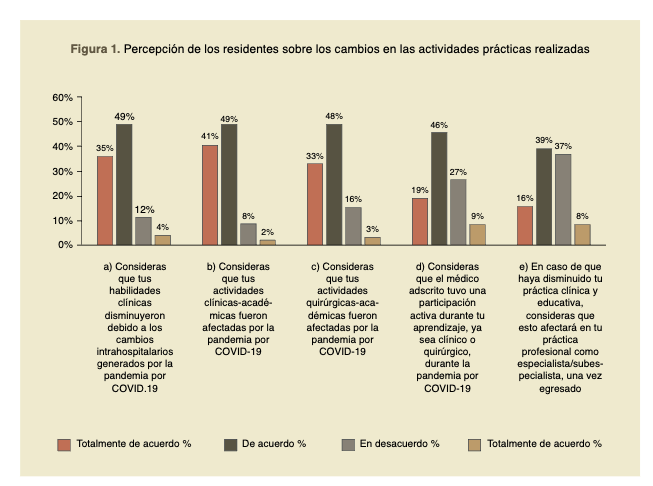 A pesar de los beneficios de la educación en línea, la mayoría de las y los residentes consideran que los aprendizajes recibidos durante la modalidad virtual no fueron suficientes para garantizar una adecuada formación como especialistas; particularmente porque en la educación de posgrado, la práctica médico-paciente es piedra angular de su formación.24
