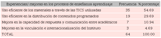 Por otra parte, el estudio cualitativo refleja que los entrevistados consideran altamente relevante las experiencias y aprendizajes, así como como el uso eficiente de los materiales a través de las TIC; en la transición a la modalidad virtual, así lo demuestran el 54.69% de la frecuencia del discurso. El 29.69% valora que a través de las TIC obtuvo un uso eficiente en la distribución de los contenidos programados, y solo un 4.69 % considera que su uso ha generado ventajas en la vinculación e internacionalización del instituto (ver Tabla 1).