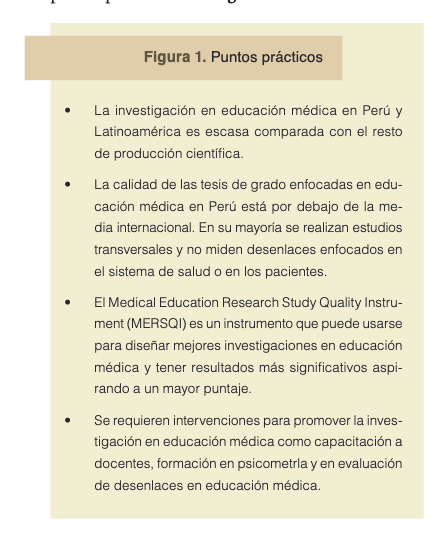 Manteniendo esto en mente, el objetivo de nuestro estudio fue describir la calidad de la tesis de pregrado enfocadas en educación médica de Perú usando el instrumento Medical Education Research Study Quality Instrument; así como identificar que otros factores influyen en la calidad. Los hallazgos más relevantes de nuestro estudio se muestran como puntos prácticos en la Figura 1.