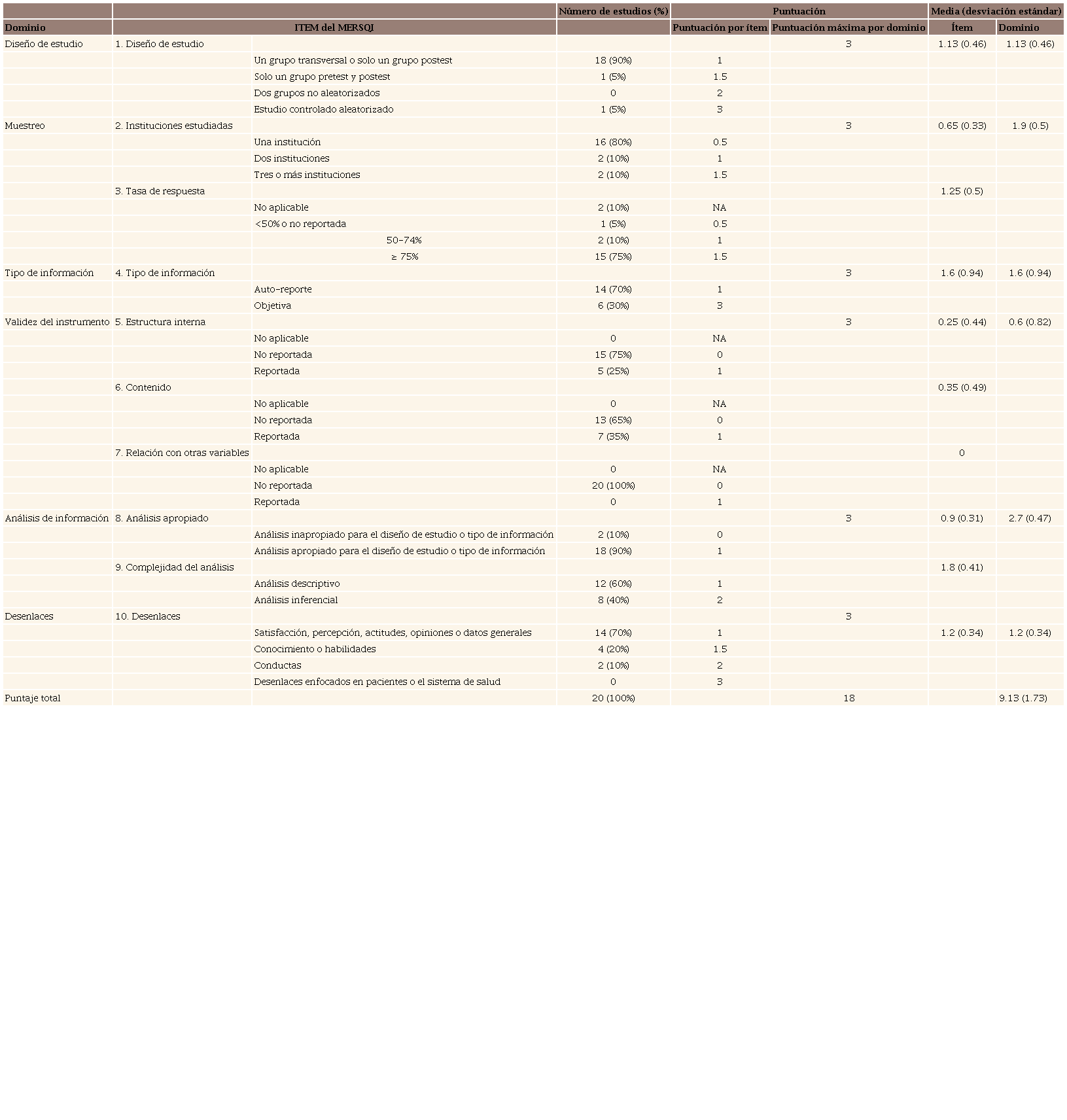 El MERSQI promedio fue de 9.13 ± 1.73. El dominio con mayor puntaje fue el de análisis de información un promedio de 2.7 ± 0.47 y el dominio con menor puntaje fue el de validez del instrumento con 0.6 ± 0.82, como se muestra en la Tabla 2.