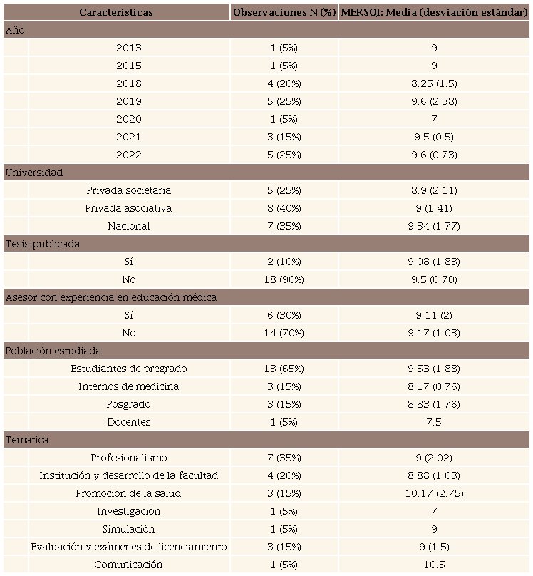 Resultados: Analizamos 20 tesis de grado enfocadas en educación médica. El MERSQI promedio fue de 9.13 ± 1.73. La mayoría de estudios fueron de diseño transversal y se enfocaron en estudiantes de medicina. El dominio peor calificado del MERSQI fue el de validez del instrumento. No encontramos diferencias significativas en el puntaje del MERSQI según tipo de universidad, tesis publicada y experiencia del asesor.