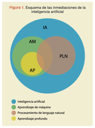 En general, los sistemas basados en IA, así como el enfoque que brinda la disciplina del procesamiento de lenguaje natural (PLN), utilizan mecanismos de aprendizaje con el propósito de entender y replicar las decisiones que los humanos ejercen para priorizar y ordenar la información por relevancia y utilidad. En el contexto del procesamiento de la información, los mecanismos de aprendizaje de máquina (aprendizaje supervisado, no supervisado, auto-supervisado y reforzado) juegan un papel fundamental al permitir el aprendizaje a partir de un conjunto de datos (etapa de entrenamiento) y mejorar su rendimiento a medida que se les proporciona más información, ofreciendo así adaptabilidad y personalización de acuerdo con el impacto de la aplicación y las necesidades de uso. La Figura 1, muestra la muy estrecha relación entre la disciplina del PLN y los enfoques de aprendizaje de máquina, cada campo posee su propia base teórica, sin embargo, todos ellas convergen al darle un sentido aplicado.