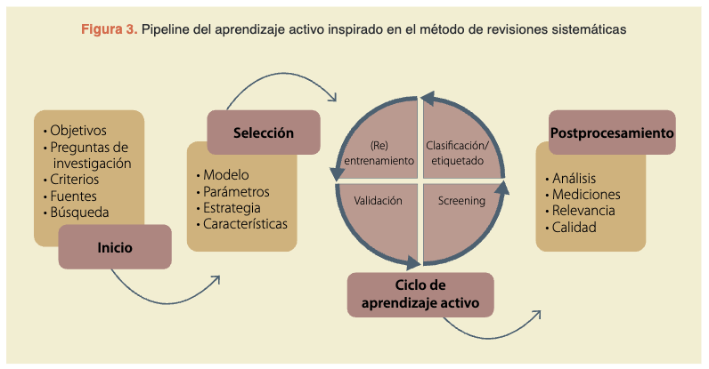 El concepto de aprendizaje activo (del inglés active learning) se inspira en un pipeline generalizado y pretende simular los procesos cognitivos del humano, al plantear un modelo autónomo para el procesado de la información mediante diversas etapas. Como primera medida, se establece una etapa capaz de elegir un conjunto de datos provenientes de una búsqueda automática a partir de criterios establecidos. Segundo, la etapa de selección contribuye a definir el conjunto de elementos técnicos relacionados con el sistema de IA, dentro de los más relevantes están la elección de un modelo y el ajuste inicial de sus parámetros. Posteriormente, la etapa de entrenamiento logra encontrar diferencias significativas reduciendo drásticamente el número de registros para llevar a cabo un primer cribado y etiquetado. Una característica notable de estos sistemas es que sus procesos van más allá de solo analizar los registros relevantes de una búsqueda por título, palabras clave y resumen, sino que también considera necesario aprender una gama complementaria de conceptos como campo y perfil del usuario, especialidad, referencias bibliográficas, etc., lo que provee de robustez, flexibilidad y precisión en el enfoque del clasificado de documentos personalizado, como se muestra en el esquema de la Figura 3.