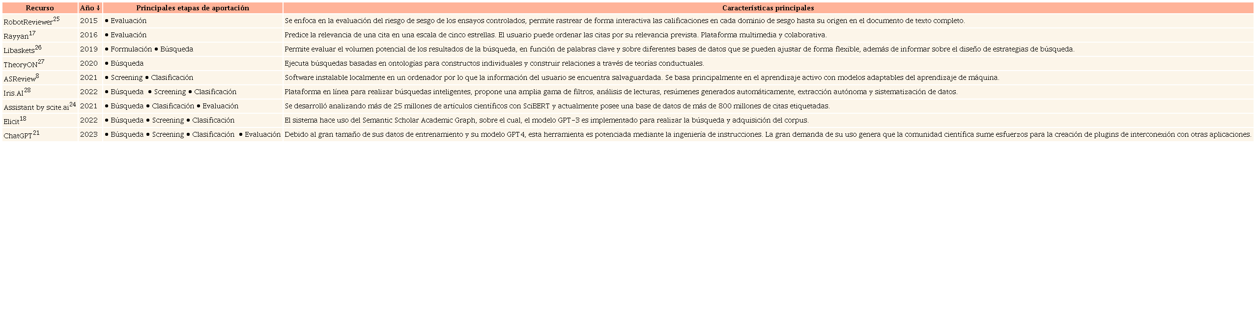 La aplicación del aprendizaje activo a la revisión sistemática se le conoce como RITL, del inglés Researcher-In-The-Loop15, y es utilizada por algunas aplicaciones enfocadas a resolver prioritariamente algunas cuestiones del manejo de información. Principalmente, esta metodología es utilizada en el proyecto ASReview que ofrece un ecosistema donde incluye detección asistida por IA, infraestructura para personalizar los modelos, así como opciones para ejecutar sistemas de simulación para beneficiar principalmente el screening16. Una herramienta similar es Rayyan17, una plataforma que ofrece un sistema que promete aprender de las decisiones que toman los usuarios para la selección del material, además de ofrecer portabilidad y un ambiente colaborativo. Otra más es Elicit, un asistente de investigación parcialmente impulsado por IA que le permite automatizar varios procesos de revisión al hacer desde búsquedas de similitud semántica con resumido textual hasta metaanálisis18. Este potencial se ha obtenido gracias a los recientes avances de los grandes modelos de lenguaje (del inglés Large Language Models) y en específico de GPT (del inglés Generative Pretrained Transformer). La Tabla 1 muestra algunas de las herramientas más utilizadas en la actualidad y su aportación significativa en alguna etapa interna del proceso de revisión.