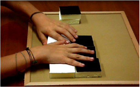 In Block Design child is asked to put together rough and smooth block surfaces in a pattern according to a model. The space is delimited by the use of a tactile drawing board with a rubber surface, which is an instrument known by blind people. It assesses orientation, and the ability to reproduce an haptic pattern (fig 1).