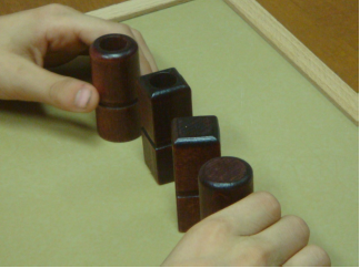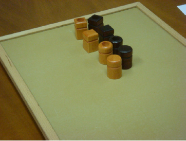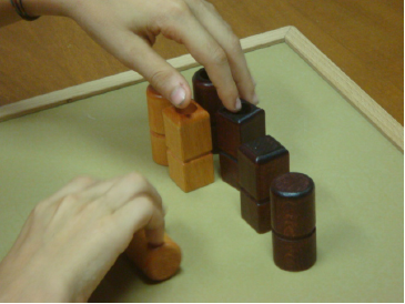 In Coding it is asked to provide a series of wooden elements (squared, circular, tall, short, with or without a circle in the middle) back to the examiner in a pattern according to a model. It assesses concentration, attention to details, and the ability to reproduce a pattern (figg. 4.1, 4.2, 4.3).
