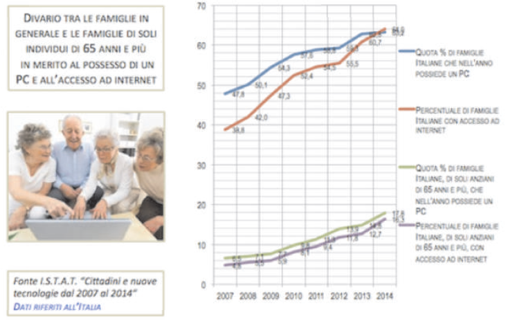 Mentre delle famiglie italiane di soli anziani di 65 anni e più, nel 2014 solo il 17,8% possiedeva un PC e solo il 16,3% aveva accesso ad internet, sempre nel 2014 il 63,2% delle famiglie Italiane possedeva un PC e addirittura il 64% l’accesso ad internet.