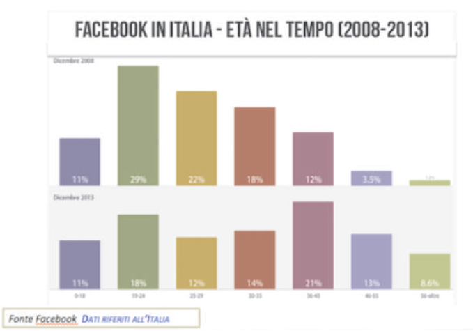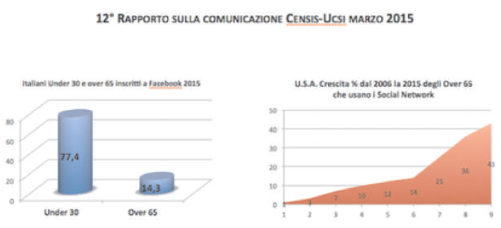 Il dodicesimo rapporto sulla comunicazione del Censis del marzo 2015 conferma che i dati vanno in questa direzione: il 14,3% degli Italiani Over 65 è su Facebook, mentre negli USA, dal 2006 al 2015, la percentuale degli over 65 che usa i social network è cresciuta del 43%.