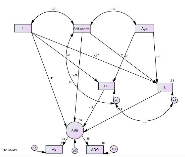 ASB, as a latent variable, was translated mostly by AS (b= .933 ; p < .001 ) and only modestly (but significantly) by Agg (b= .396 ; p < .001 ). P and SCont were significantly correlated and with significant covariance estimates ( -3.168 ; p < .001 ). P directly predicted ASB (b= .438 ; p < .001 ), presenting the strongest effect on ASB of the entire model, and showed significant negative effects on FE (b= -.220 ; p < .001 ) and L (b= -.266 ; p < .001 ). The effect of SCont on ASB was very small and not statistically significant but it was close to the admissible significance value (b= -.087 ; p = .068 ). SCont significantly predicted L (b= .325 ; p < .001 ) and revealed significant covariances with e6 (FE) ( 55.732 ; p< .001) and age ( -.997 ; p= .005 ).