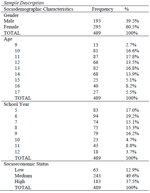 The sample was gathered in three schools from the region of Coimbra (Portugal) and included all the 489 individuals who, together with their parents, agreed to collaborate. 1217 requests were sent from which 40,18% consented to participate, with the characteristics presented in table 1. Socioeconomic status was determined based on the parents’ job title and qualifications (Simões, 1994).