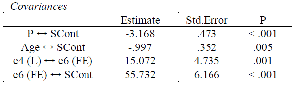 The negative role of age was confirmed on FE (b= -.207 ; p< .001 ) and L (b= -.271 ; p < .001 ). FE showed a significant role on ASB (b= -.123 ; p = .007 ), such as L (b= -.287 ; p < .001 ). The errors of these mediating variables had significant covariance and correlations between them. 50% of variance in ASB was accounted for by this model. Table 3 shows, in detail, regression weights from the final model and table 4 presents covariance estimates.