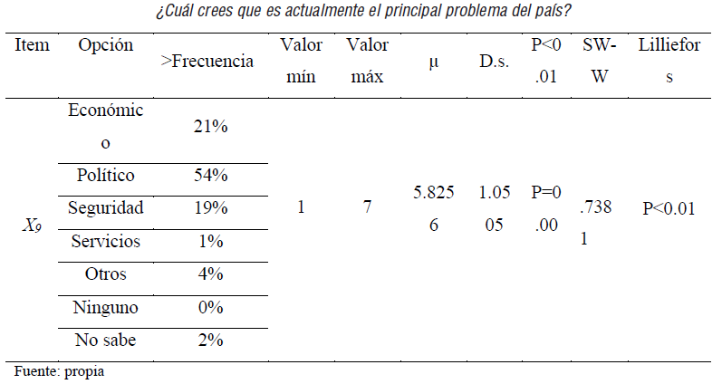 La tabla 9 busca identificar cuál es el principal problema del país según la percepción de los estudiantes universitarios. El 54% considera que es “político”, el 21% cree que es “económico” y el 19% que es “seguridad”. El SW-W es de .7381, por lo tanto, se puede asumir que los datos descritos son confiables.