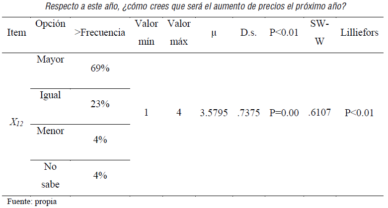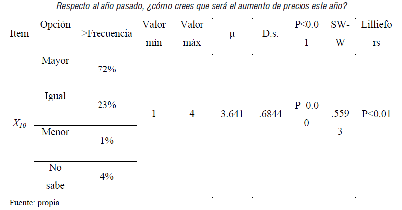 En la tabla 10 se muestra que el 72% de la población encuestada estima que el aumento de precios de este año será mayor que el observado el año pasado. Con un SW-W de .5593, es suficiente para considerar que ciertamente existe una mayoría que pronostica mayor crecimiento de precios.