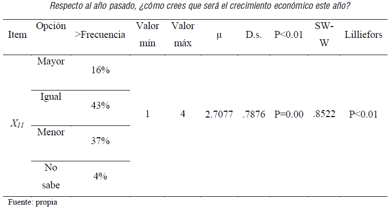 La tabla 11 muestra que la mayoría de los estudiantes afirman que dadas las contrariedades económicas que vive nuestro país, el crecimiento económico de este año será “menor” o “igual” que el año pasado. A su vez, el estadístico SW-W, siendo mayor que .05, con .8522, indica que existe evidencia suficiente para corroborar que los jóvenes presentan una considerable inquietud ante tal situación.