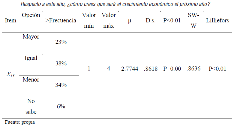 La tabla 13 muestra que el 38% de los estudiantes opina que para el próximo año el crecimiento económico será “igual” respecto a este, seguido de un 34% que prevé un crecimiento “menor” en el mismo escenario; dicho dato es corroborado al presentar un valor de .8636 en la prueba SW-W.