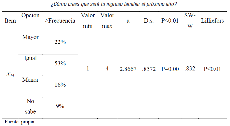 La tabla 14 refleja que un 53% de los estudiantes entrevistados considera que su ingreso familiar será “igual” para el próximo año, con un valor en la prueba SW-W de .832, que da certeza de que tal creencia es generalizada dentro de la población encuestada.