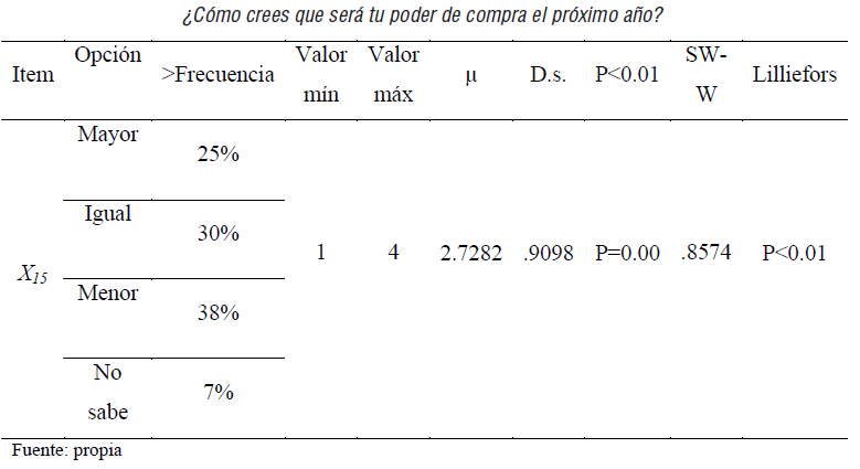 En la tabla 15, se puede observar que el 38% de los estudiantes cree que su poder de compra el próximo año será “menor”. La prueba SW-W supera el .05, por lo que existe evidencia para asegurar que son la mayoría quienes perciben dicha situación en la economía del país.