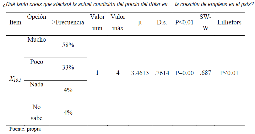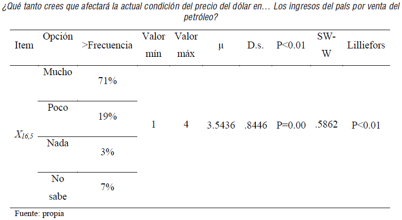 En la tabla 20, se muestra que el 71% de la población encuestada estima que el actual precio del dólar impactará “mucho” los ingresos del país por venta del petróleo. Con un SW-W de .5862, es suficiente para considerar que ciertamente existe una mayoría que pronostica tal afección.