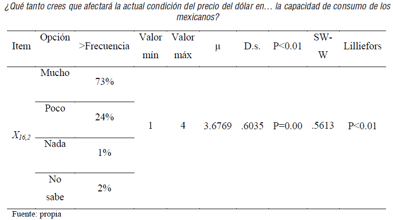 Como puede verse en la tabla 17, el 73% opina que el actual precio del dólar afectará “mucho” la capacidad de consumo de los mexicanos. El valor que toma la prueba SW-W es de .5613, lo cual da sustento a que los valores antes mencionados se apegan a la realidad.