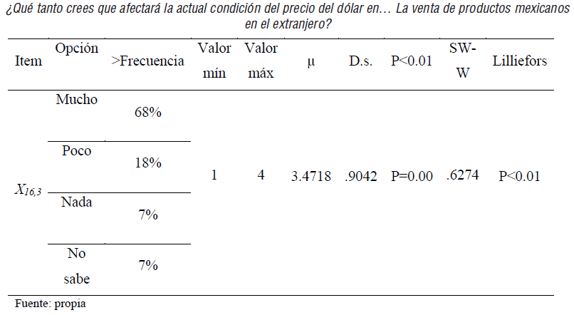 Como se observa en la tabla 18, el 68% de los encuestados considera que los recientes precios del dólar afectarán “mucho” la venta de productos mexicanos en el exterior. El estadístico SW-W es de .6274, valor suficiente para afirmar que dichos datos dan una explicación precisa a la pregunta en cuestión.
