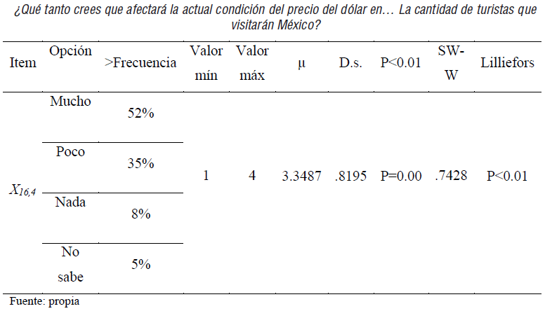 La tabla 19, muestra que el 52% de los entrevistados declara que la presente condición de la paridad peso dólar afectará “mucho” la cantidad de turistas que visitarán México. El SW-W es de .7428, por lo tanto, se puede asumir que los datos descritos son confiables