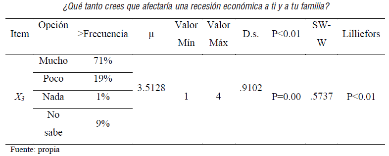 La tabla 3, muestra que el 71% de los estudiantes opina que una recesión económica afectaría “mucho” a su economía familiar; dicho dato es corroborado al presentar un valor de .5737 en la prueba SW-W.