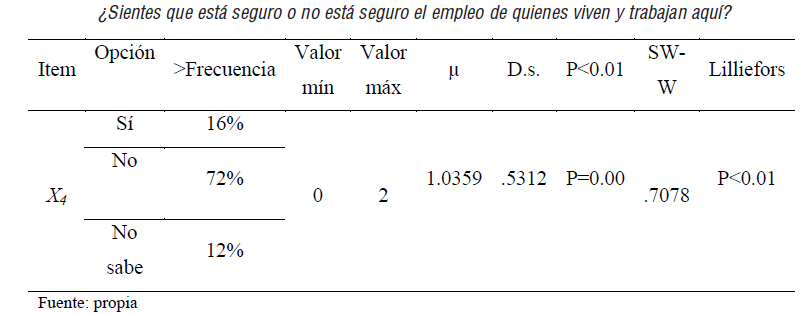 La tabla 4, refleja que un 72% de los estudiantes entrevistados opina que no siente seguro el empleo de quienes laboran en el país, con un valor en la prueba SW-W de .7078, que da certeza de que tal creencia es generalizada dentro de la población encuestada.