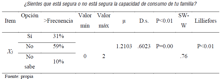 Es claro que la mayor parte de los encuestados piensa que la capacidad de consumo de su familia no está segura. La prueba SW-W marca un valor de .76, lo cual da respaldo a la idea de inestabilidad en la economía familiar dado que es un valor mayor a .05.