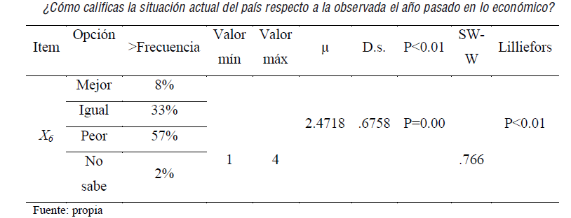 En la tabla 6, se puede observar que el 57% de los estudiantes considera que la situación actual del país con respecto al año pasado en lo económico es “peor”. La prueba SW-W supera el .05, por lo que existe evidencia para asegurar que son la mayoría quienes perciben dicha situación en la economía del país.