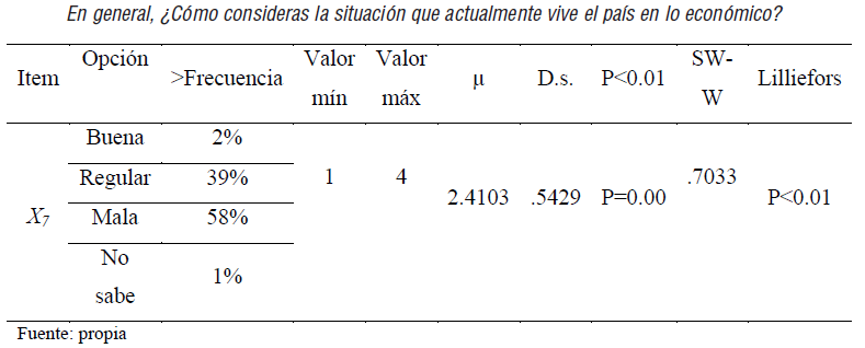 Como puede verse en la tabla 7, el 58% opina que la situación actual del país en lo económico es “mala”, seguido por un 39% que piensa que tal situación es “regular”. El valor que toma la prueba SW-W es de .7033, lo cual da sustento a que los valores antes mencionados se apegan a la realidad.