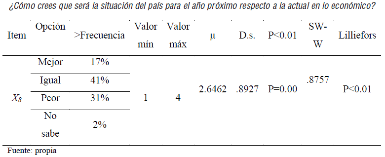 Como se observa en la tabla 8, el 41% de los encuestados considera que el próximo año, la situación del país será “igual”, acompañado de un 31% que prevé que la condición será “peor”. El estadístico SW-W es de .8757, valor suficiente para afirmar que dichos datos dan una explicación precisa a la pregunta en cuestión.