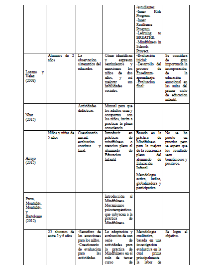 En cuanto a los estudios revisados sobre la práctica de la atención plena en el ámbito de la Educación Infantil, los resultados indican que la mayoría se centran en el diseño de programas o propuestas de intervención para promover la educación emocional en el aula, a través del Mindfulness (ver tabla 2).