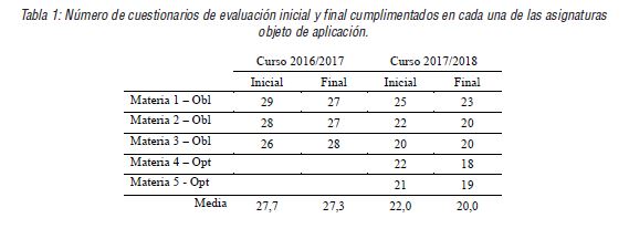 El cuestionario de evaluación inicial se cumplimentaba en la primera sesión presencial de cada materia, utilizando los alumnos sus dispositivos móviles u ordenadores, logrando así una familiarización con esta metodología en presencia del responsable de la asignatura.