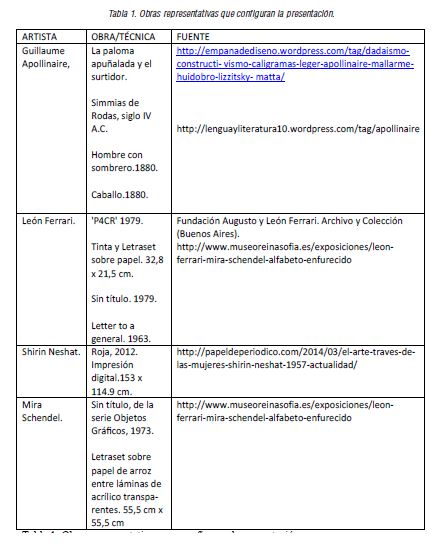 La actividad “Alfabeto Visual”, se desarrolló en tres fases. En primer lugar, fase de apreciación, se comienza con el visionado de imágenes artísticas en las que los participantes podían ver una serie de caligramas de diferentes artistas que emplean la técnica del caligrama como herramienta para sus proyectos artísticos. (Veáse, Tabla 1). Está técnica consiste en frases o poemas en los que la tipografía, caligrafía o el texto crea una especie de imagen visual (poesía visual) que expresa visualmente lo que la palabra o palabras dicen. (Véase, Fig. 1).