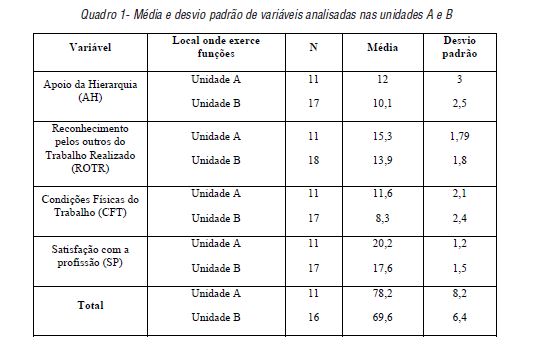 A amostra maioritariamente feminina (86,2%), com idades compreendidas entre 21 a 55 anos e uma média de 41 anos e 55,2% são casados. No que diz respeito à categoria profissional, 65,5% da amostra são enfermeiros de nível I; 20,7% são especialistas, 50% dos quais em reabilitação, 50% em médico-cirúrgica e 13,8% possuem mestrado. Relativamente ao vencimento auferido, 75,8% dos enfermeiros consideram-se totalmente insatisfeito e/ou bastante insatisfeito; 31% afirmaram estar totalmente insatisfeitos com a profissão. A média global da satisfação profissional (Quadro 1), situa-se entre 78,2% 69,6%, com um desvio padrão de 8,2 e 6,4 respetivamente nas unidades B e A.