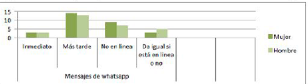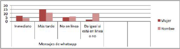 Después de analizar estos datos, se observa que no existen diferencias entre ambos grupos, destacando como respuesta mayoritaria “no me importa que me contesten más tarde”, seguido –en los jóvenes de centros normalizados– de la respuesta “me gusta que me conteste enseguida, nunca me fijo si está en línea o no”. Por el contrario, en los jóvenes pertenecientes al centro de menores, la segunda respuesta más elegida es “no me importa que me conteste más tarde, siempre y cuan- do no esté en línea”.